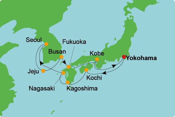 Vanuit Yokohama (Tokyo) vaar je naar mooie Japanse kustplaatsen en boeiende steden van Zuid-Korea.