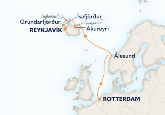 Vaar langs de spectaculaire kusten van Noorwegen en IJsland en geniet van de ongerepte natuur van Noord-Europa. Ervaar het charmante art-nouveaucentrum van Ålesund, de botanische tuinen van Akureyri en de ontzagwekkende fjorden van IJsland. Deze route is ook als 14-daagse cruise te boeken rondom IJsland met vertrek en aankomst in Rotterdam.