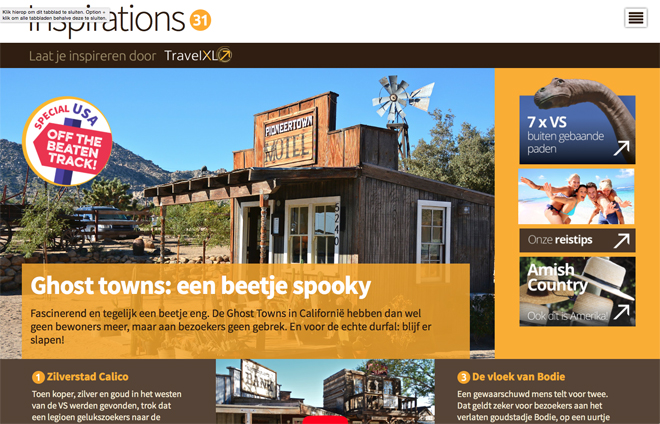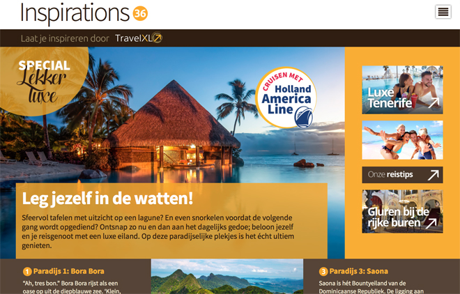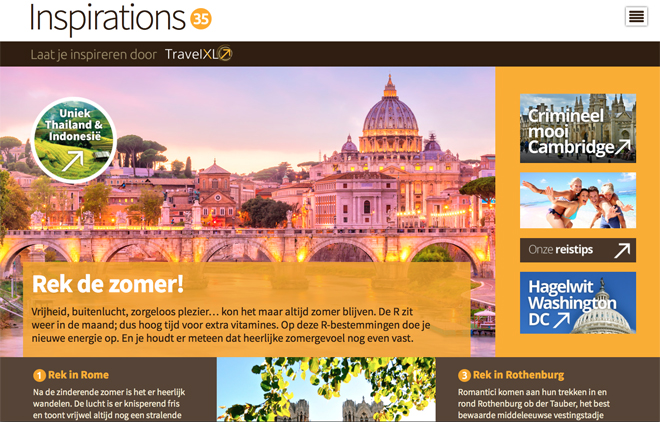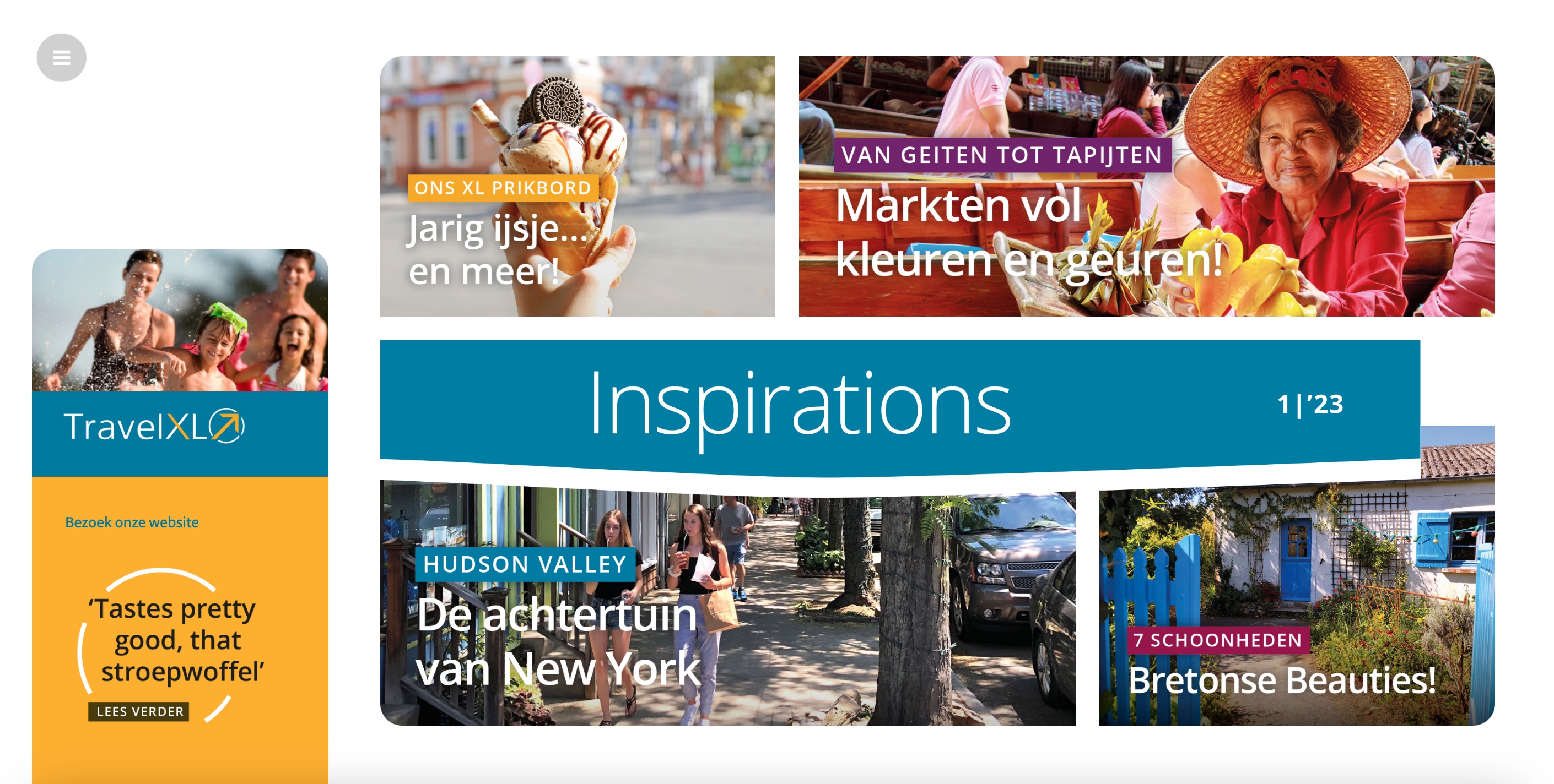 Plannen maken voor een nieuwe vakantie of een heerlijk weekendje weg? Beleving en inspiratie spelen daarbij een belangrijke rol. TravelXL helpt je daar graag bij met het inspiratiemagazine 'Inspirations'. Dit wordt 3x per jaar naar meer dan 92.000 email adressen verstuurd. Wil je dat ook jouw vrienden en kennissen deze ontvangen? Geef dit dan door aan je eigen Travelcenter of deel elke uitgave via Facebook of meld je hier aan.