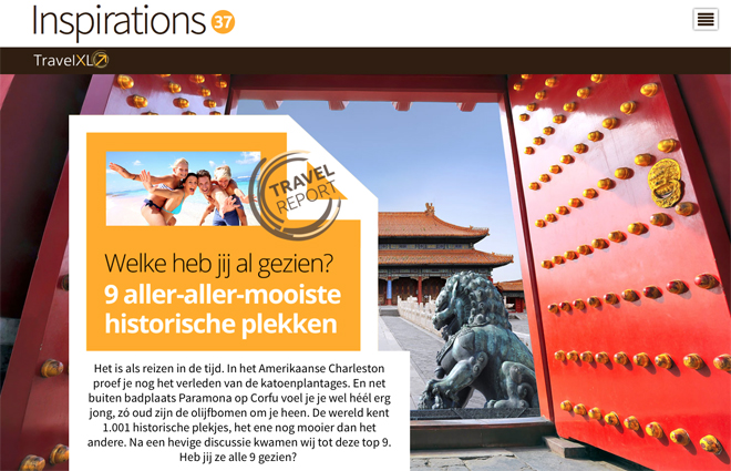 ROMANTISCHE KERST! De geur van glühwein verspreidt zich al over de pleinen. Het Salzburger Land is klaar voor de adventperiode. Vanaf eind november verrijzen gezellige kerstmarkten en geven de kerstlichtjes de straten een gouden gloed. Romantisch genieten dus, niet alleen in Salzburg. Onze nieuwe Inspirations toont je waar nog meer. ALLER-ALLER-MOOISTE HISTORISCHE PLEKKEN Het is als reizen in de tijd. In het Amerikaanse Charleston proef je nog het verleden van de katoenplantages. En net buiten badplaats Paramona op Corfu voel je je wel héél erg jong, zó oud zijn de olijfbomen om je heen. De wereld kent 1.001 historische plekjes, het ene nog mooier dan het andere. Na een hevige discussie kwamen wij tot deze top 9. Heb jij ze alle 9 gezien?
