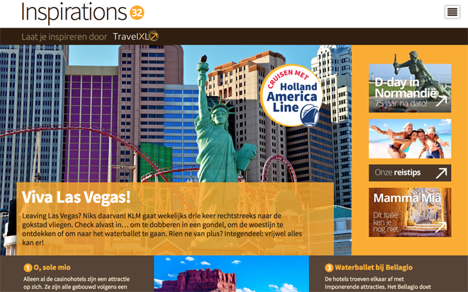Wat is de overeenkomst tussen Las Vegas? NO WAY!, Normandië, 75 jaar na D-Day? Portofino, Comomeer, Napels, Puglia, Sicilie, Nieuw Statendam, Holland America Line ? Je leest er alles over in de nieuwste Inspirations. Las Vegas waar KLM wekelijks drie keer rechtstreeks naar de gokstad gaat vliegen. Check alvast in om te dobberen in een gondel, om de woestijn te ontdekken of om naar het waterballet te gaan. Rien ne va plus? Normandië, op 6 juni 2019 wordt in het Franse Normandië de 75e herdenking van D-day en de Slag om Normandië herdacht. Niet alleen dan, maar in heel 2019 vinden allerlei evenementen en tentoonstellingen plaats. Hoog tijd om de vrijheid te vieren én te beleven. Aan jou de keuze: Las Vegas of in Normandië..... Je leest er alles over in de nieuwste Inspirations van TravelXL